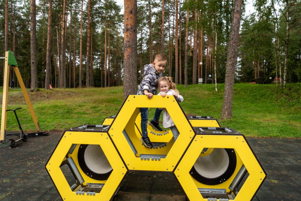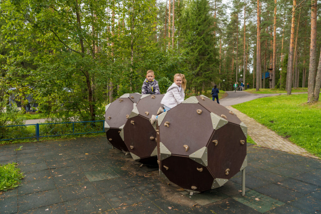 Детские площадки напротив столовой и рядом с веревочным парком в свободном доступе, а так же есть площадка WorkOut напротив здания столовой.